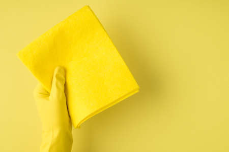 worker's hand in a yellow rubber protective glove with a pink-beige sponge or washcloth. A maid or housewife takes care of the house. general or regular cleaning.