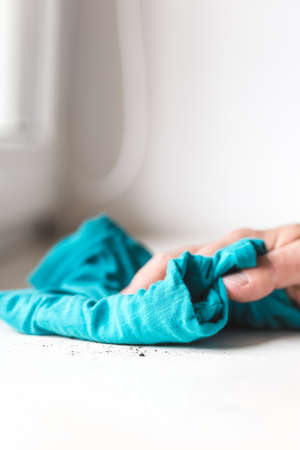 Male hand without gloves rubs dust from the windowsill. Mopping with a blue rag. Housekeeping concept. Selective Focus on the dust