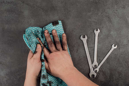 close up of person hand cleaning table with cloth