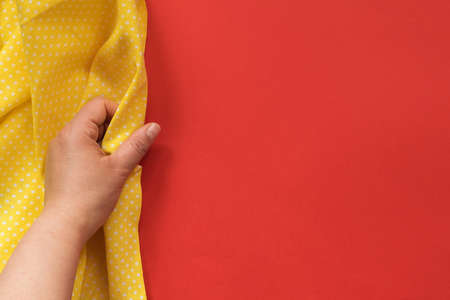 Microfiber cloth on yellow background, top view. Spring cleaning and household concept. Advertising space with copy space, flat lay.
