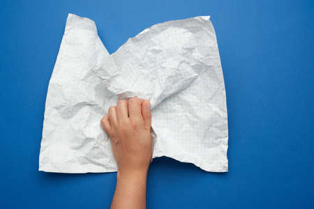 female hand sticking out of a torn hole in a blue paper background and holding a dry rag