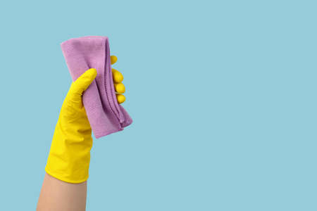 a hand in a yellow rubber cleaning glove holds a dry rag on a blue background. Part of the body stick out of the hole in the paper, banner