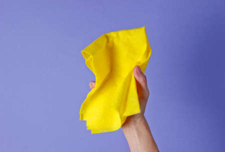 A bright yellow cleaning cloth on a blue background. Minimal concept of cleanliness. flat lay.