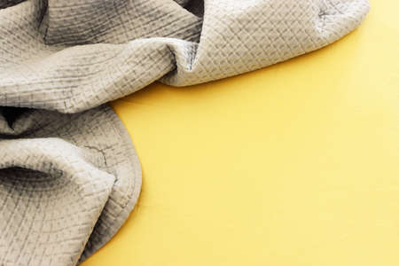 Bright trending yellow background with gray fabric. Top view. Minimalism concept. Perfect for presentations, decor and web design.