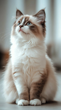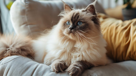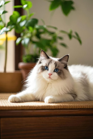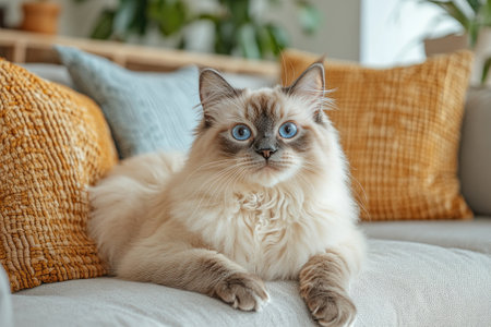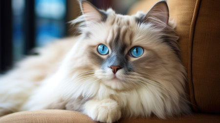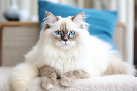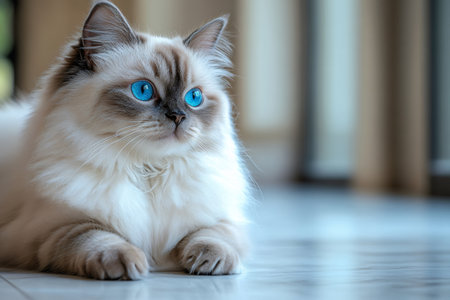 Ragdoll cat with blue eyes sitting in a cozy room