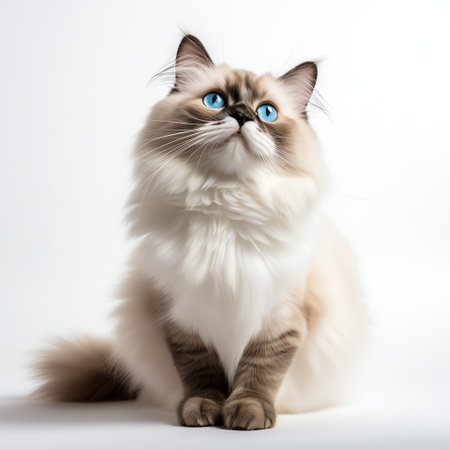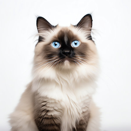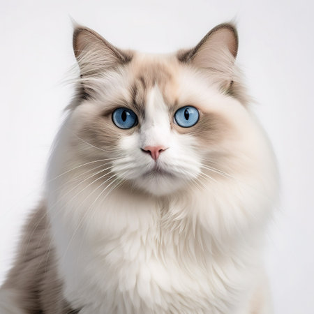 Charming Ragdoll Cat with Big Bright Blue Eyes on a Pure White Background, Exuding Tranquility