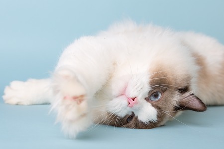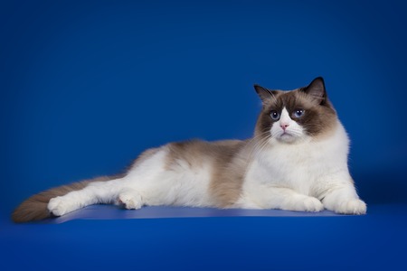beautiful ragdoll cat with blue eyes on a blue background