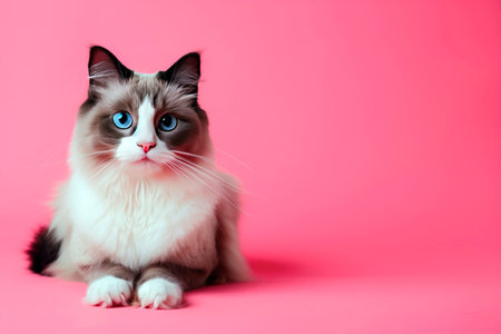 Beautiful blue eyed Ragdoll cat sitting on pink background with copy space