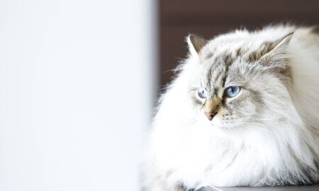 Elegant gaze of the blue-eyed white cat Fairy-fluttering ragdoll cat