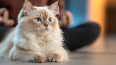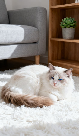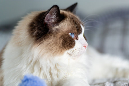 Closeup of relaxed ragdoll cat in peaceful home.