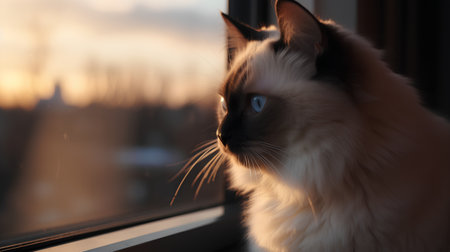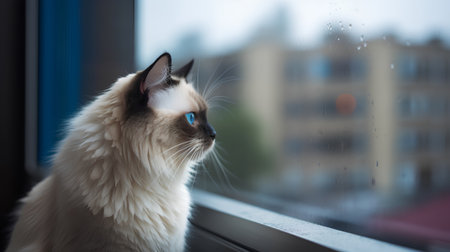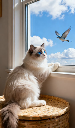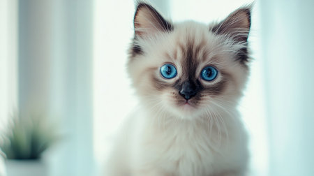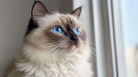 This charming male bicolor Ragdoll cat features striking blue eyes. Captured near a window, it exudes a calm and curious demeanor, perfect for cat lovers.