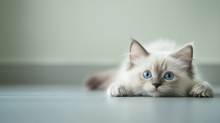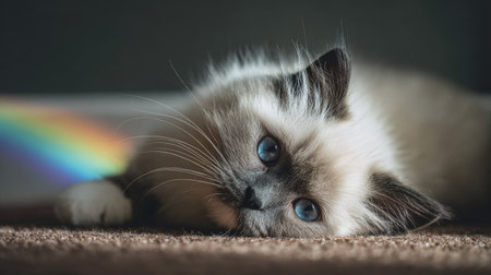 Beautiful ragdoll cat lying on the floor, showcasing its stunning blue eyes and fluffy fur