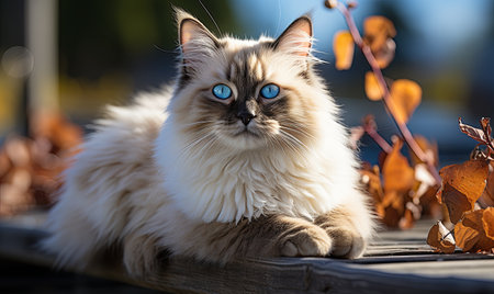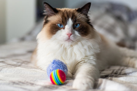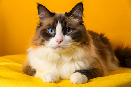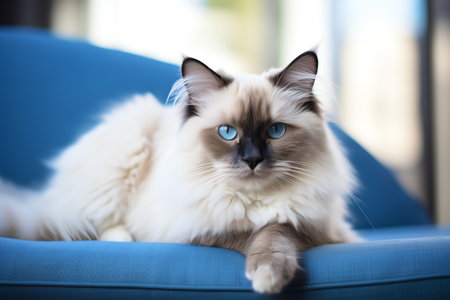 A Ragdoll cat sits serenely, showcasing its plush semi-long fur, striking blue eyes, and colorpoint pattern, a hallmark of the breed. Known for their docile nature and affectionate personality, Ragdoll cats are often referred to as puppy cats due to their tendency to follow their humans around.