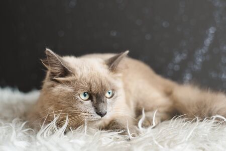 Fluffy cat with blue eyes lying on the carpet and looking at the camera