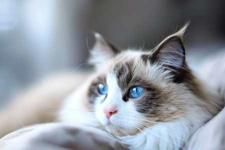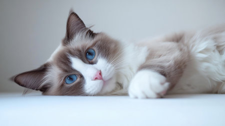 A charming male Ragdoll cat with a soft blue bicolor coat resting comfortably. Its bright blue eyes and calm demeanor create a serene atmosphere, making it an ideal image for pet lovers.