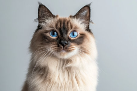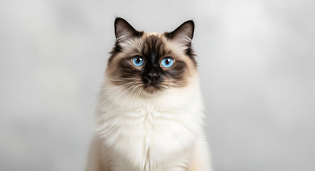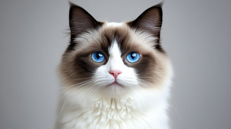 Stunning Ragdoll Cat with Enchanting Cyan Eyes and Luxurious Soft Fur on a Clear Grey Background