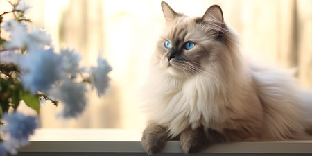 Portrait of ragdoll cat with blue eyes lying and look away by sunny window, with green flower tree background