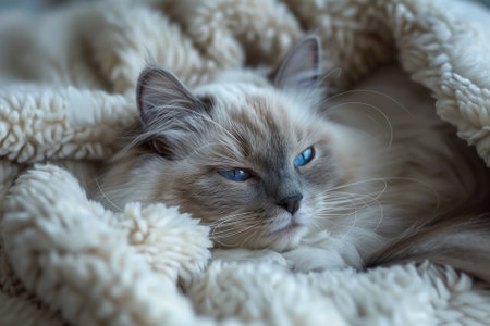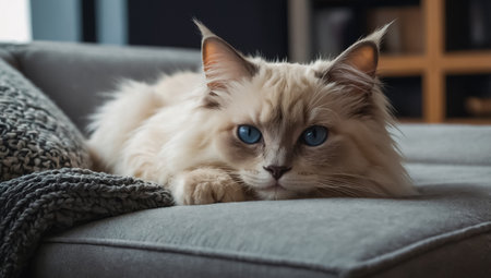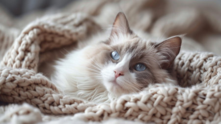 cute cat photography, relaxed ragdoll cat lounging on a soft blanket, staring into the distance with its blue eyes, radiating pure bliss