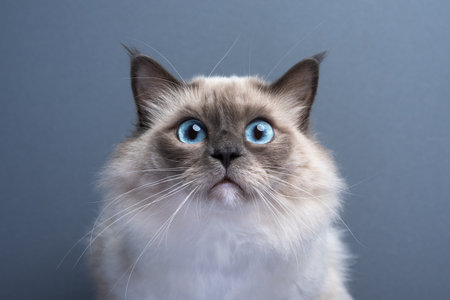 blue eyed Birman cat looking schocked or surprised at camera, funny cat portrait with gray background