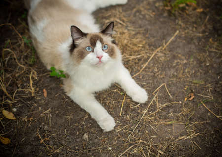 beautiful young cat of Ragdoll breed walks on the street, outdoors