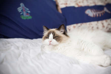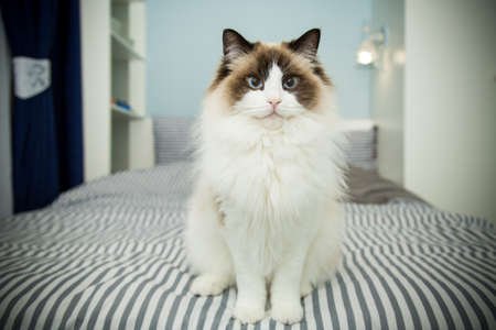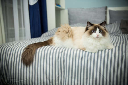 Young healthy beautiful purebred Ragdoll cat, on the bed