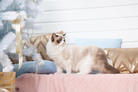 Luxurious ragdoll cat stands on knitted blanket against background of decorative pillows near Christmas tree. Pedigreed cats. Christmas gifts and decorations. Blue-eyed cats. Photo shoot for cat.