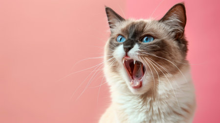 Snowshoe, angry cat baring its teeth, studio lighting pastel background