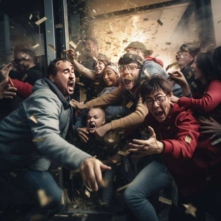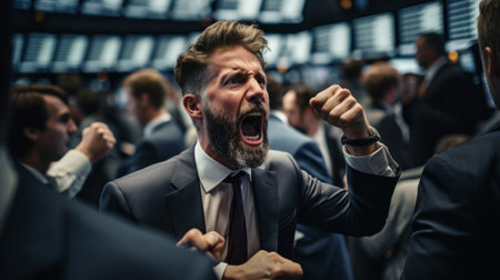 Trading floor frenzy broker shouts orders surrounded by market chaos screens data rush