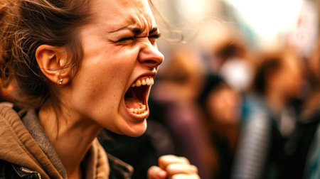 “Young Woman Expressing Anger with Open Mouth Against Purple Background.â€