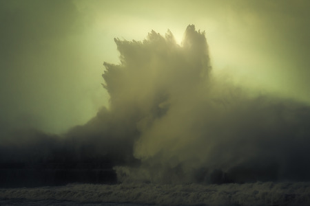 Stormy wave over old lighthouse and pier of Viavelez in Asturias, Spain.