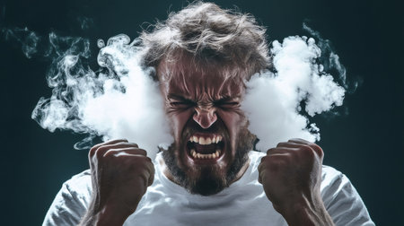 Stressed caucasian man with beard screaming and exhaling smoke from his mouth with closed eyes and clenched fists, expressing anger, frustration, and stress relief against a dark background