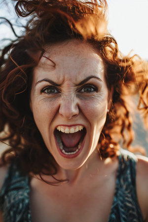 A close-up portrait of a man expressing intense anger and frustration, featuring his vibrant red curly hair and strong facial features against a neutral background.