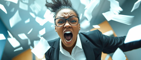 A businesswoman expresses intense rage, her papers scattered around, embodying the chaos and pressure of corporate life.