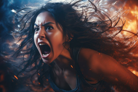 Young woman with a vivid expression of shock or fear, set against a dynamic, fiery backdrop