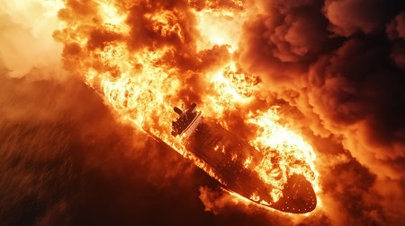Fire on a cargo ship. A ship carrying liquefied gas caught fire. Explosion and fire on an oil tanker on the high seas. Shelling of an oil or gas tanker. 3D rendering. Illustration. Tankers.