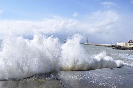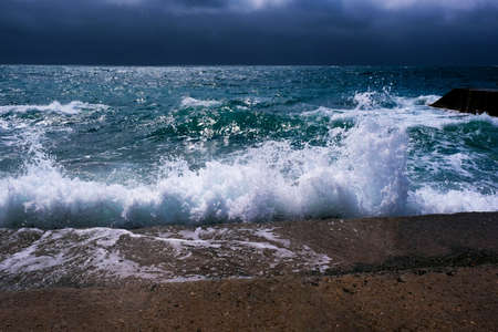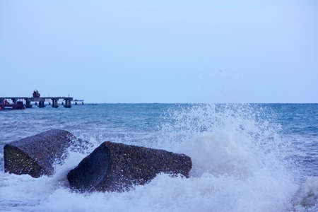 Stormy weather, waves and splashes in Batumi, Georgia. Stormy Black sea. Water background.