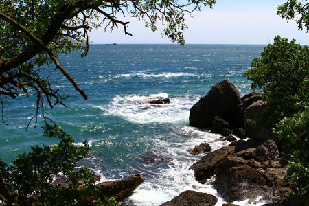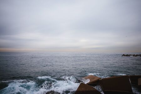 Beautiful view of the restless sea near the stone coast. Natural landscape