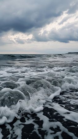 Majestic ocean waves crash softly against the shore, framed by a brooding sky of clouds, evoking a sense of tranquility and the raw beauty of nature's coastal landscapes.