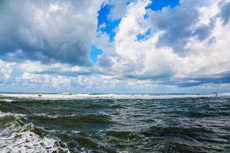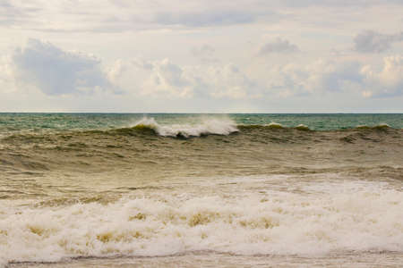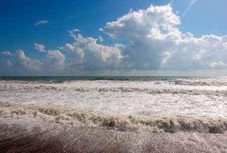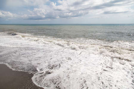Picturesque landscape beach. Turquoise sea with waves and foam and beautiful clouds in the sky