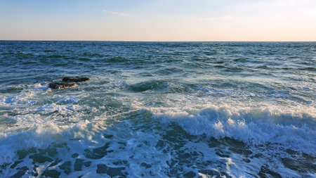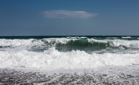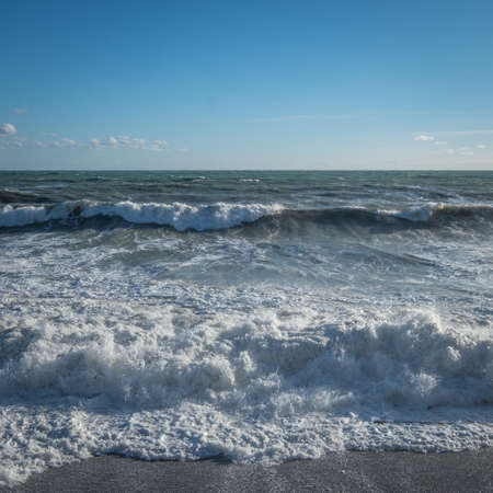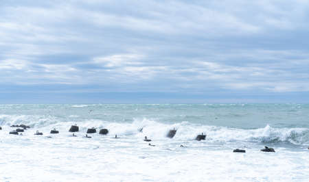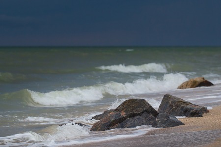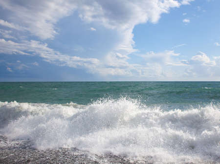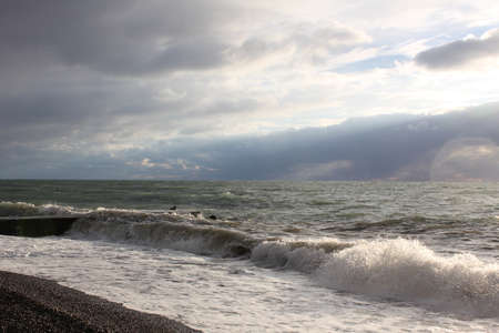 Big waves on the Black Sea. Stone beach. The photo was taken near the resort town of Anapa.