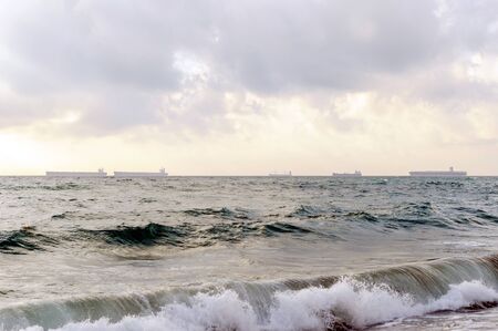 Storm at Black sea in spring. Sea view with waves during rain and cloudy in Alupka. Crimea