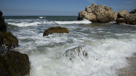 The waves of the turquoise sea break on the coastal boulders and a dense white foam is formed. clear blue sky. White waves breaking on sandy beach through gap in rocks on sea