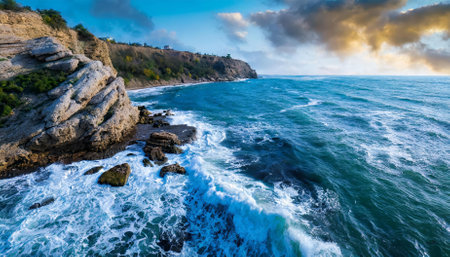 Rocky Black Sea coast of Bulgaria.View over waves hitting the rocks on Black Sea coast, Cape Kaliakra.