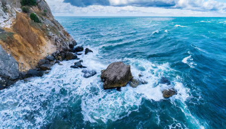 A stunning aerial capture of the oceans vivid blue waves crashing with force against jagged coastal rocks, perfectly embodying the untamed energy and serene allure of a pristine seascape under