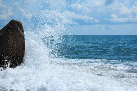 Sea wave splashes on a stony beach. Beautiful seascape.