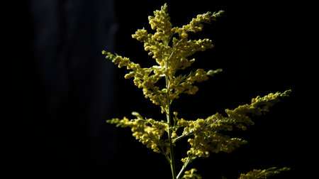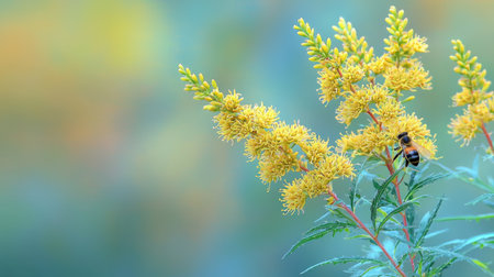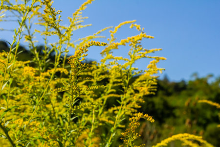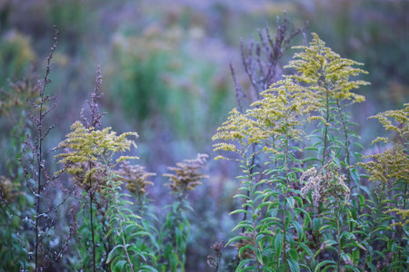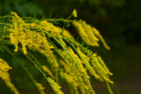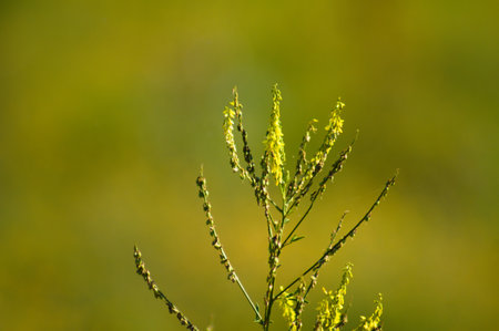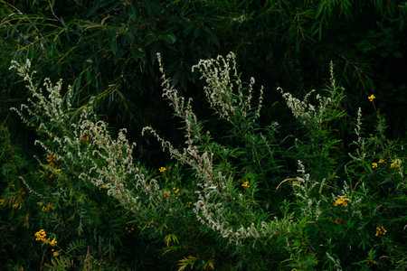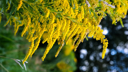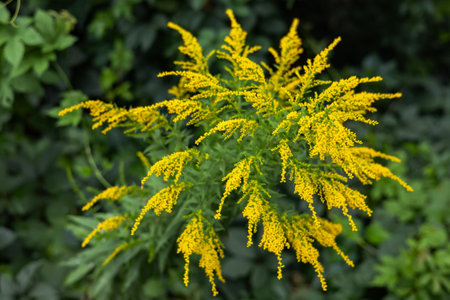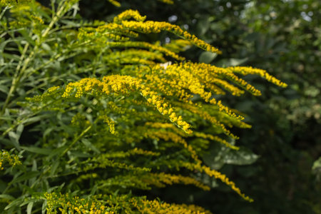 Common ragweed displays its distinctive yellow flowers amid a vibrant green backdrop thriving in a natural habitat during the late summer season.