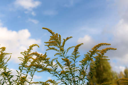 goldenrod flower in a meadow closeup against the sky