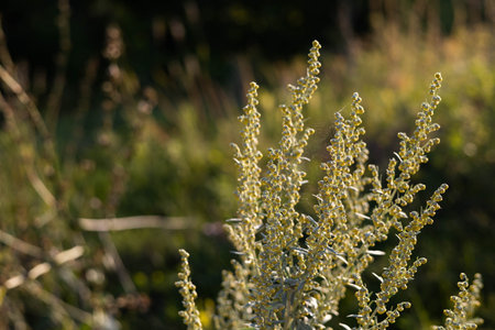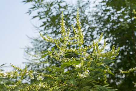 Artemisia vulgaris, common mugwort flowers in meadow closeup selective focus