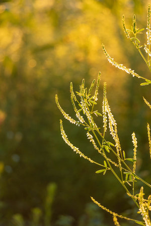 Beautiful summer morning during golden hour in a meadow with local plants. Seasonal scenery.