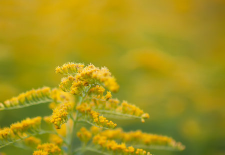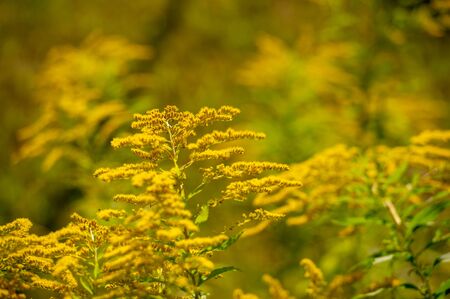 Yellow flowers of goldenrod. Weed culture grows in the field.